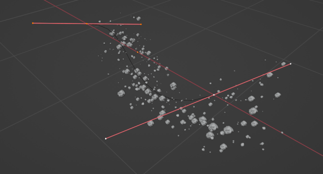 The SkyFi Asset Set comes with three Asteroids, created using modifiers. These are then fed into a Geometry Nodes set up that distributes them as a field along a Bezier Guide Curve.