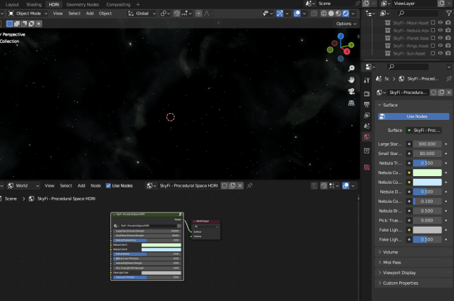 Use the Shader Node to control everything, from star emission strength for both small and large stars, to Nebula colors, details, and transparency.